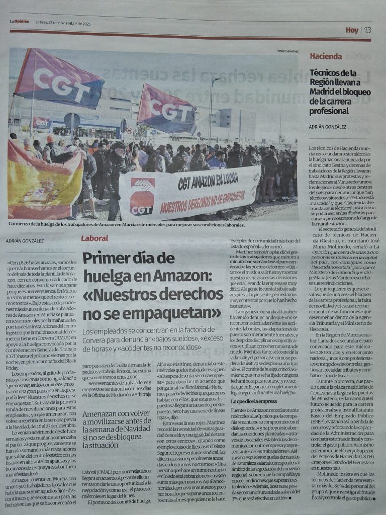 26/11/2025 – CADENA SER: Amazon Murcia afronta tres días de huelga por mejoras laborales en plena campaña del Black